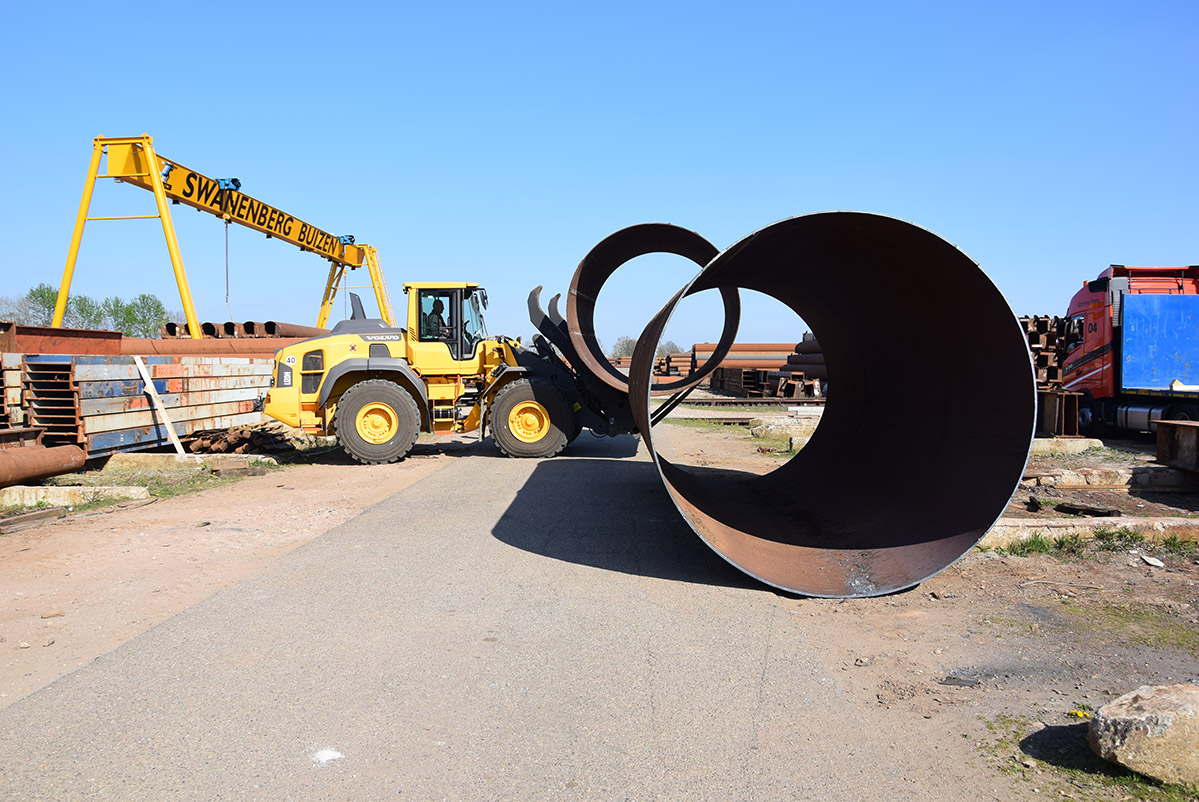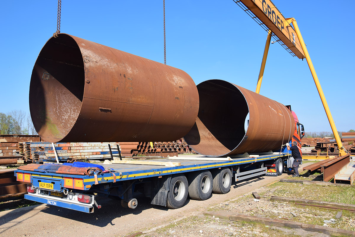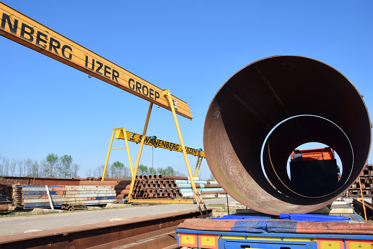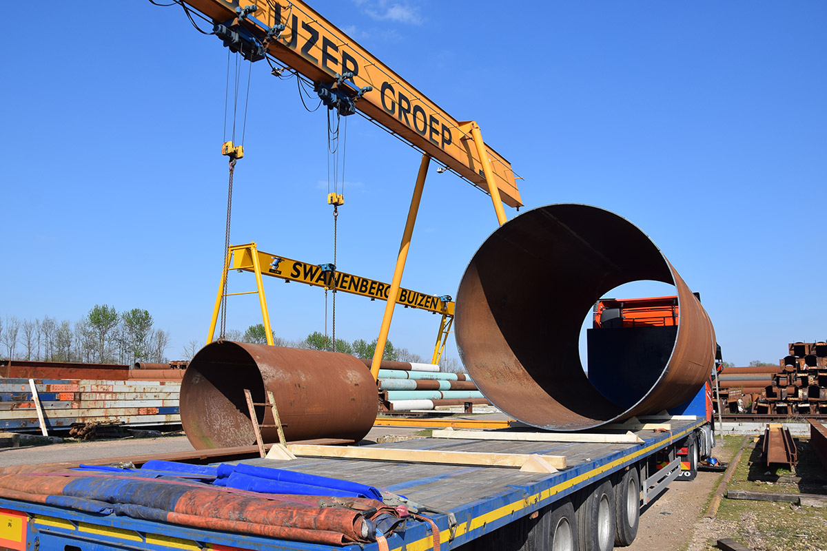 Deze buizen zijn meer dan twee meter doorsnee. Van oorsprong dienden ze als onderdelen van autoclaven in Duitsland. Swanenberg IJzer Groep nam ze over en maakte ze volledig schoon en klaar voor transport voor een klant in Oostenrijk. Waar ze momenteel dienen als tijdelijke constructie in een infraproject.